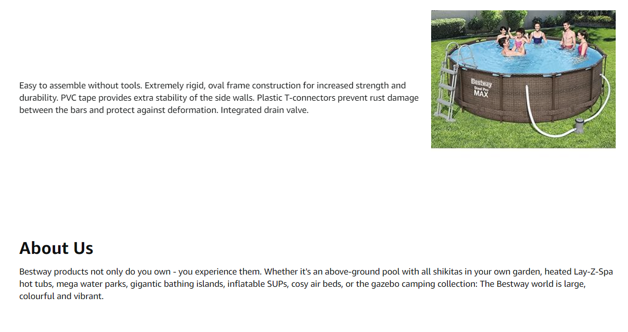 Utilisation normale d une piscine ,très facile à monter ,je l ai fait seule en très peu de temps . Elle a très beau rendu