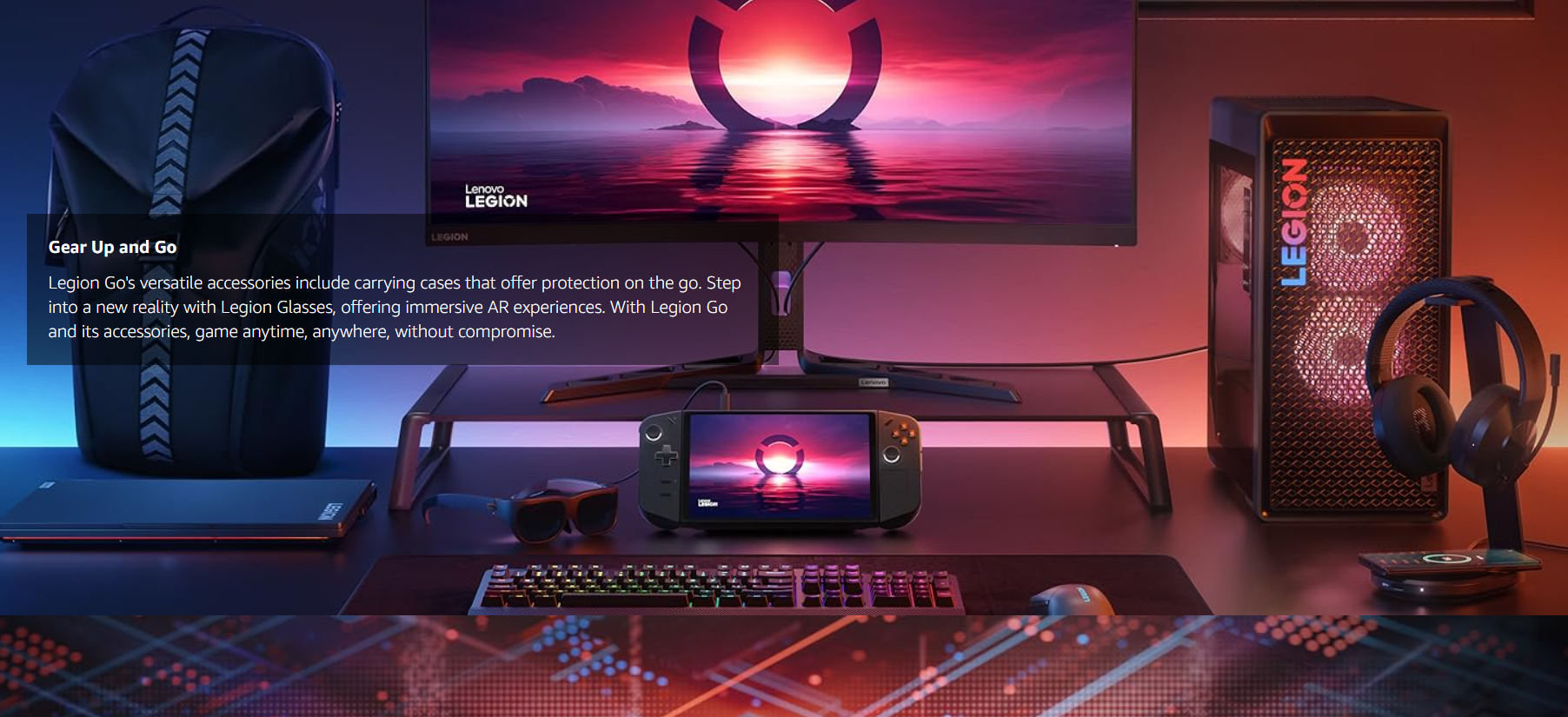 • Included in the box - Legion Go Portable Gaming PC (Base module & Legion TrueStrike Controllers), Controller base, 65W Power Adapter and Carrying Case.