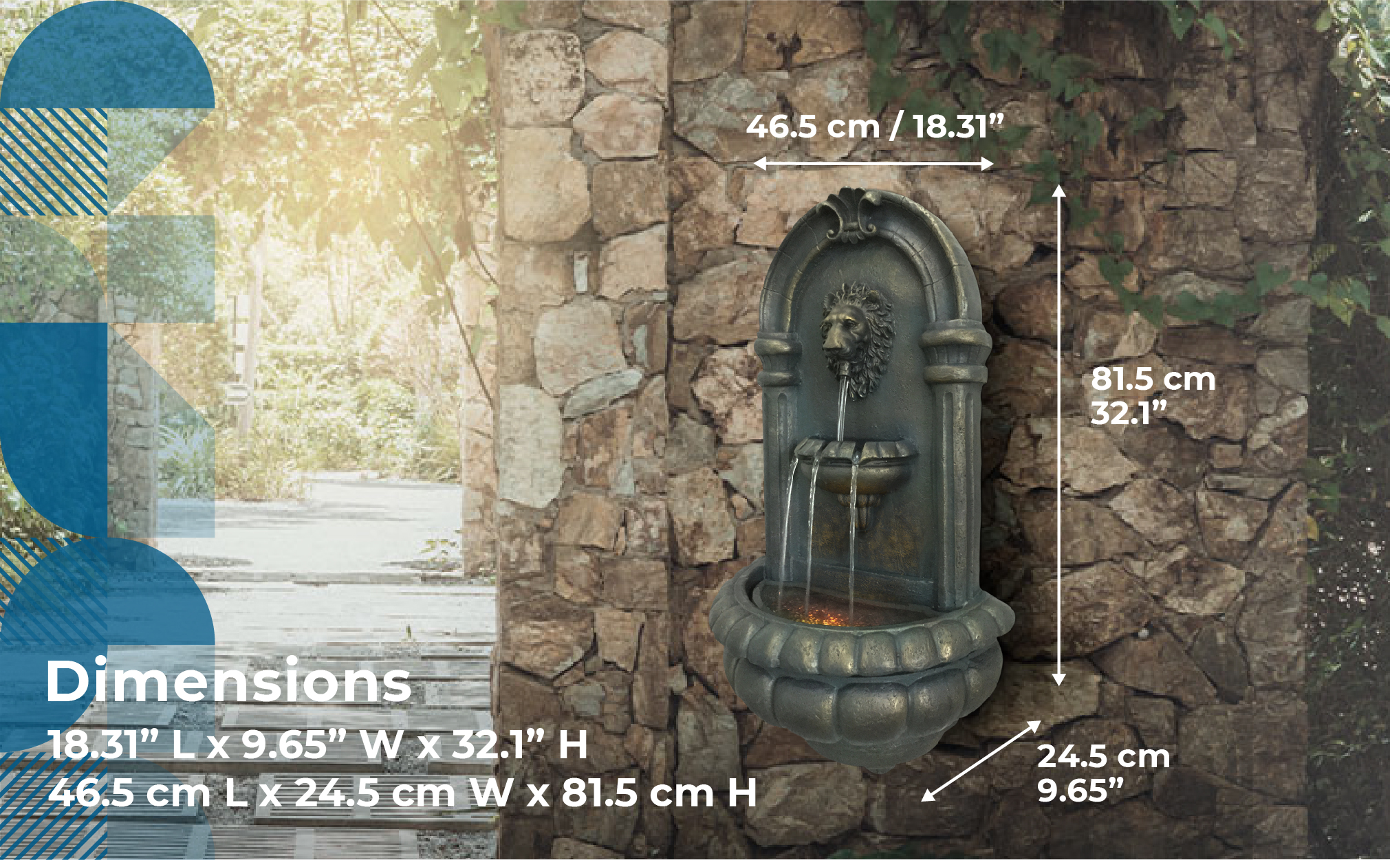 Add old-world charm to your lawn with the elegant Peaktop Outdoor Tiered Lion Head Stone Wall Fountain with LED Light. This decorative wall fountain provides a tranquil and soothing addition to your porch, patio, or backyard. Featuring a timeless design with a natural stone finish and a lion head, this wall fountain is a stylish addition to your home's outdoor area. Constructed from durable, lightweight resin with a natural look and realistic stone texture, the fountain is weatherproof, rust-resistant, and resilient. Relax to the sounds of the soft, water as it flows out of the lion's mouth to the tiers below. The included LED lights keep this fountain lit to illuminate your garden. For quick installation and convenient operating, the water fountain includes all necessary parts and a pump. This decorative water fountain measures 18.31" x 9.65" x 32.1" to fit almost any outdoor space.