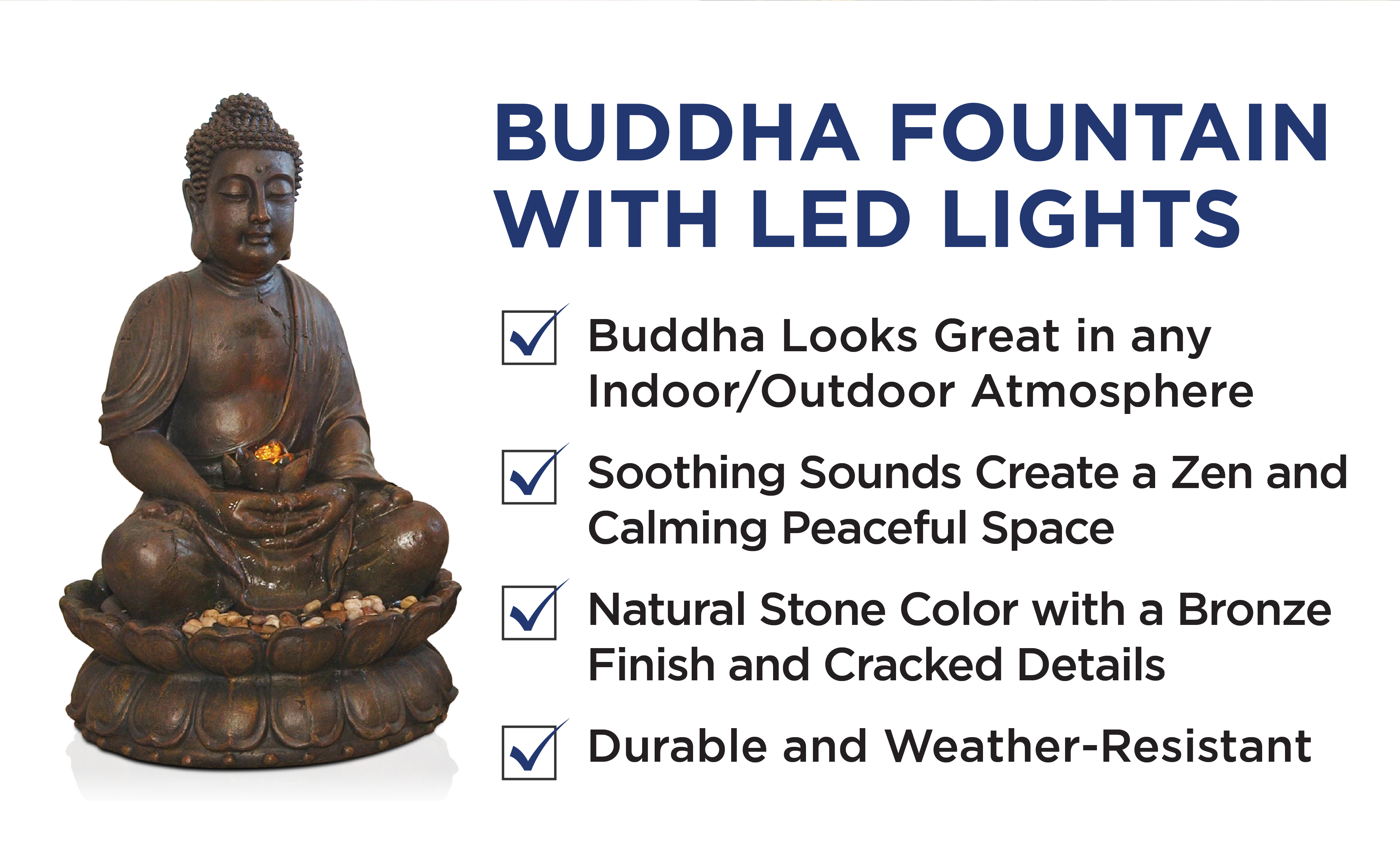 • BUDDHA FOUNTAIN STATUE: Calming Buddha looks great in your yard or garden, or placed on your deck or home office décor, while interior pump with LED lights keeps the water flowing - just plug it in!