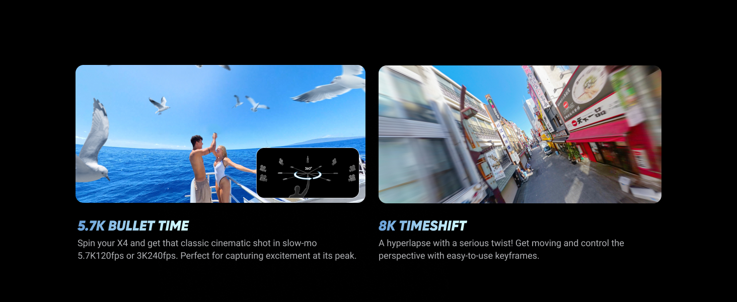- IMMERSIVE 360 VIDEO - The 8K era is here. Insta360 X4 delivers 360° video in stunning 8K or 5.7K60fps! Use Active HDR to keep shots color accurate too, even in action scenarios.