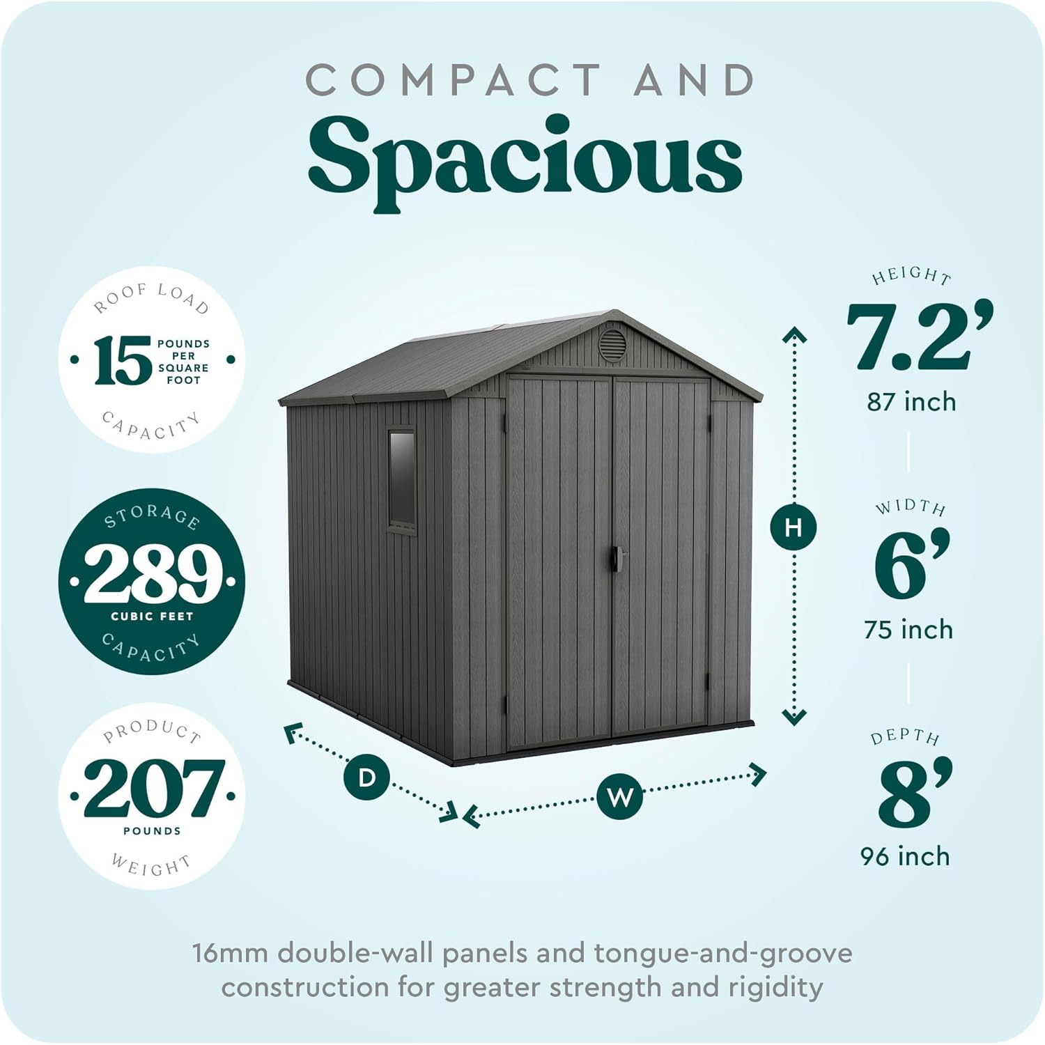Keter Darwin 6x8 Ft All-Weather Heavy-Duty Resin Outdoor Storage Shed with Double Lockable Doors, Floor Panel, & Built-in Ventilation, Graphite Grey