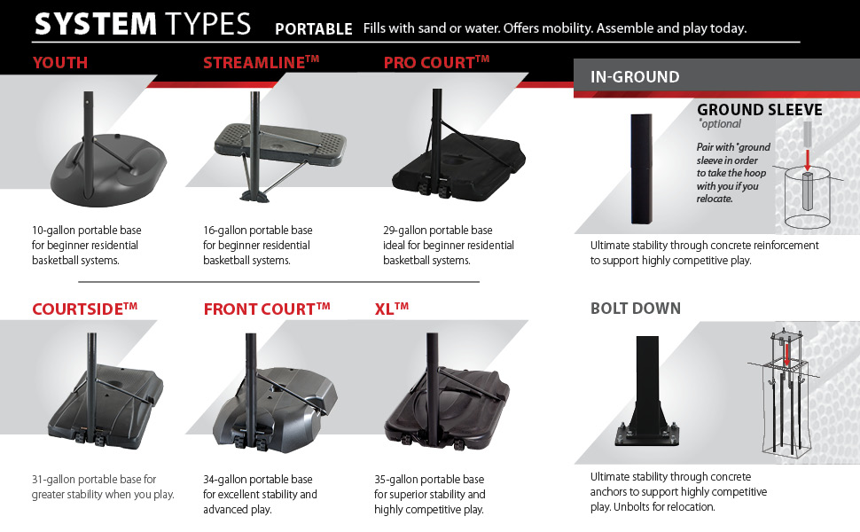 Hone your jumpshot in your spare moments or perform a backyard dunking drill with this Lifetime Shatter Guard XL portable basketball system. Unlike in-ground basketball hoops--which are typically anchored in concrete--this portable system rolls on wheels, letting you position the basket support in any desired location, from the back patio to the middle of the cul-de-sac. All you have to do is fill the heavy-duty 35-gallon base with water or sand and play.